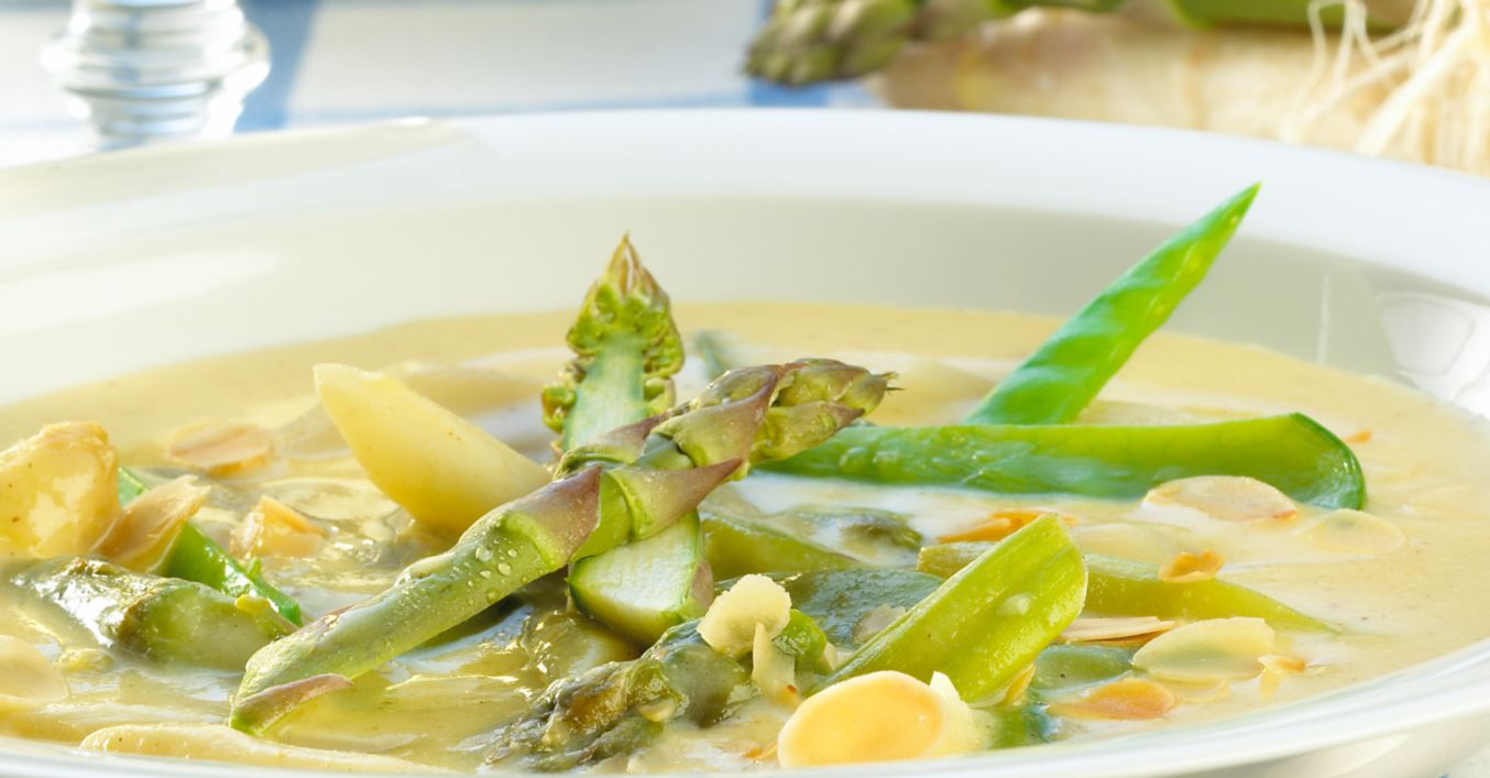 Polévku takto povaříme asi 10 minut na mírném plameni. Úplně na konci do polévky vložíme chřest, luskový hrášek a jen krátce prohřejeme. Podáváme s posypkou z pražených mandlí.