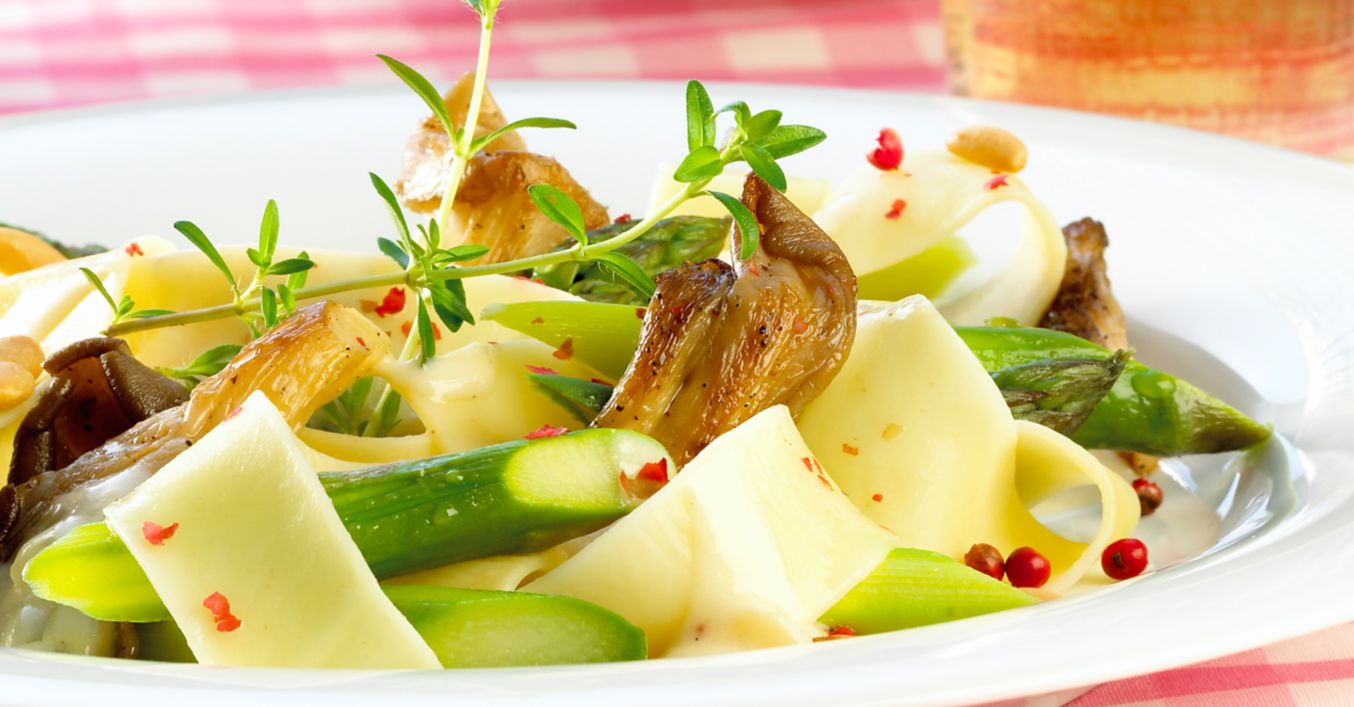 Chřestové těstoviny s hlívou a pecorino omáčkou