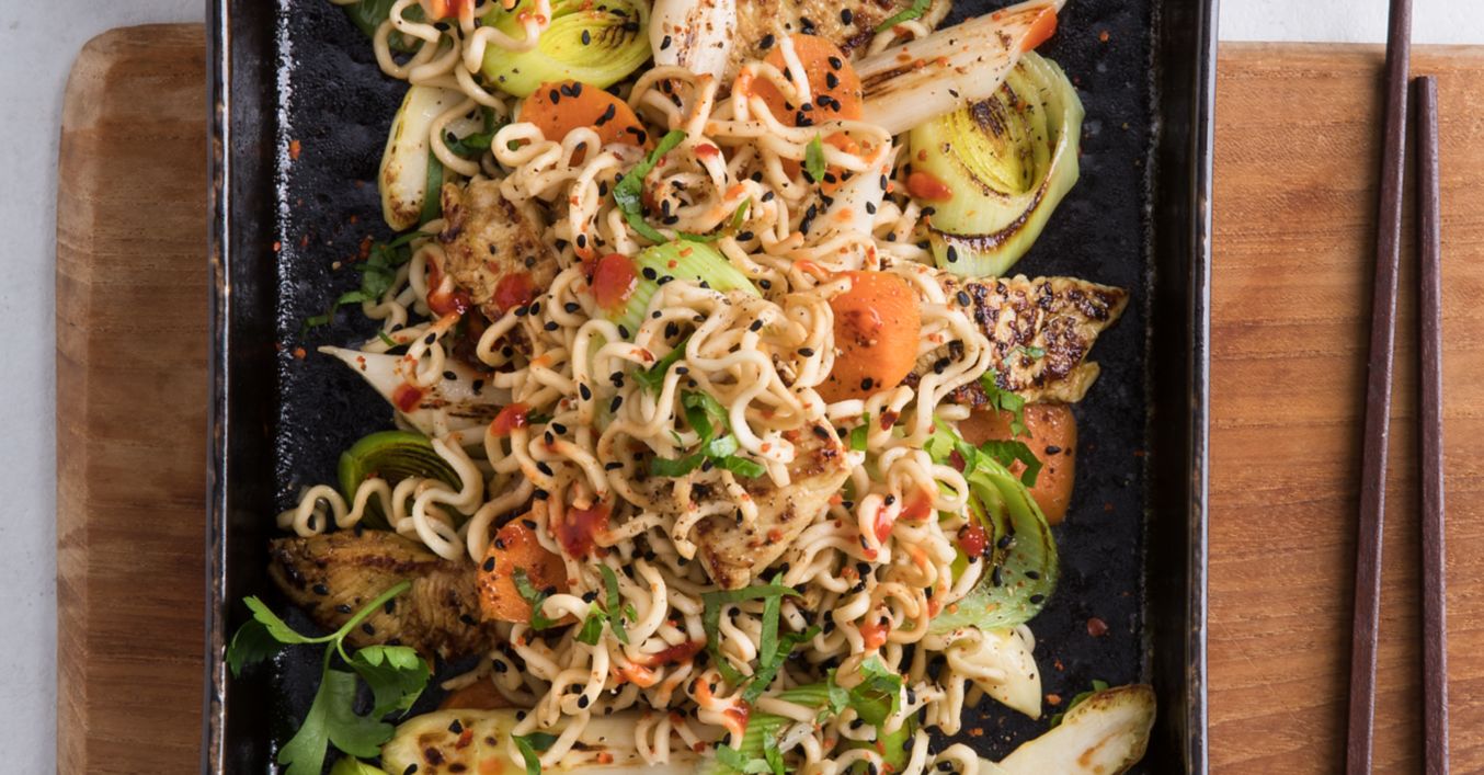 Očištěnou a oloupanou mrkev a pórek nakrájíme na tenká kolečka. Chřest umyjeme, zbavíme konců, oloupeme po celé délce a nakrájíme na 4 cm dlouhé dílky. Všechnu zeleninu poté zprudka a krátce opečeme na rozpáleném sezamovém oleji. Dáme stranou a opečeme i krůtí nudličky. Když jsou hotové, vrátíme zpět zeleninu, přidáme vývar, sezam, trochu cukru a hotové nudle. V rychlosti promícháme a ihned servírujeme.