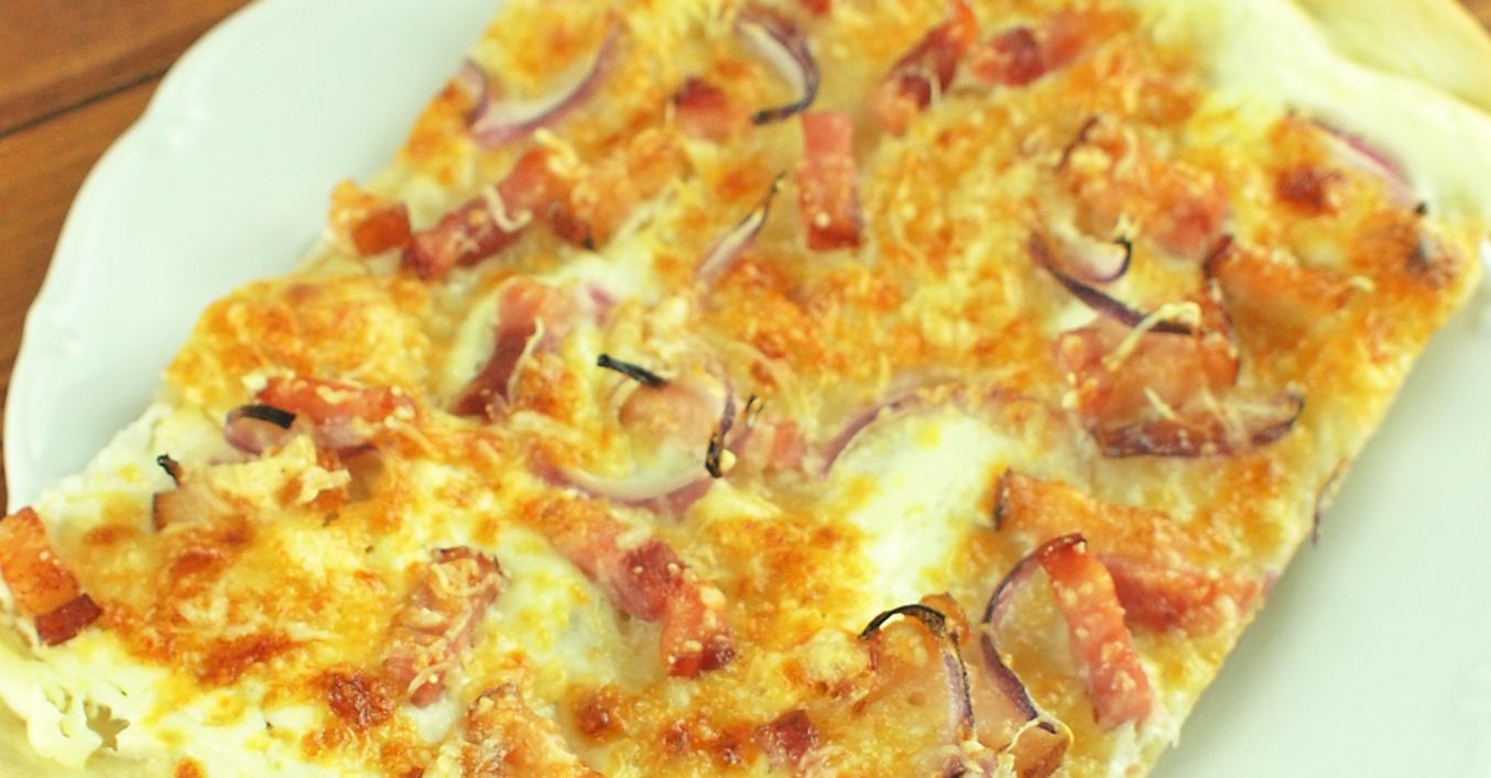Těsto vyndáme z lednice a necháme chvíli povolit při pokojové teplotě. Rozbalíme a přeneseme na plech (vystlaný pečícím papírem). Slaninu nakrájíme na tenké nudličky. Cibuli oloupeme a také nakrájíme na nudličky.