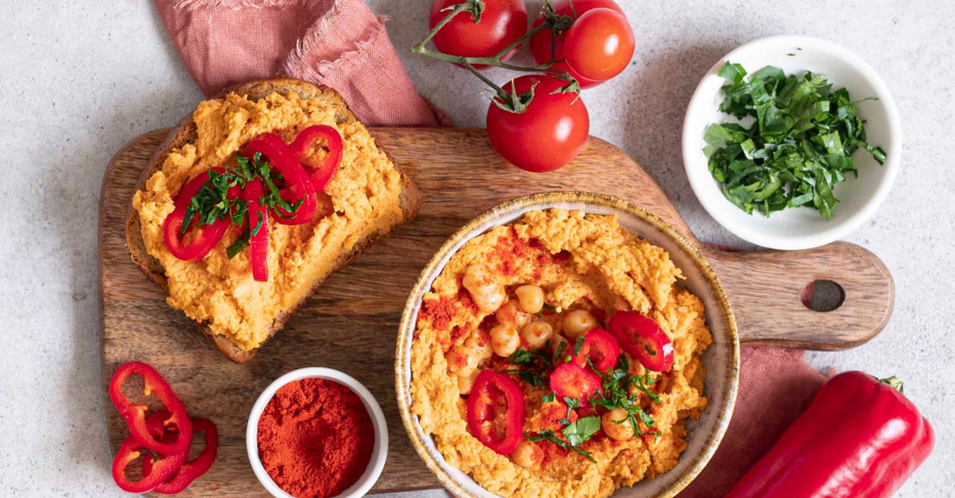 Orestovanou papriku, cizrnu, citrónovou šťávu, česnek, mletou papriku, olivový olej, sůl a pepř rozmixujte najemno.