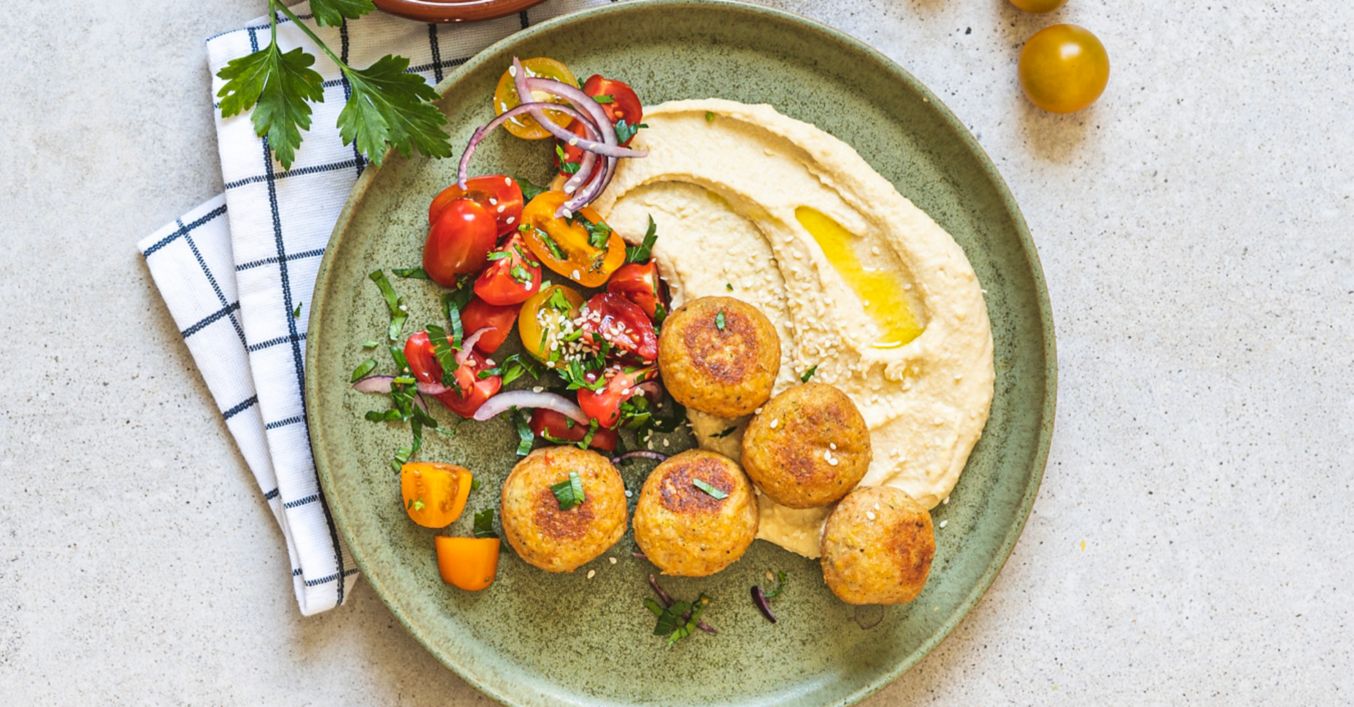 Cizrnový falafel s hummusem a rajčatovým salátkem