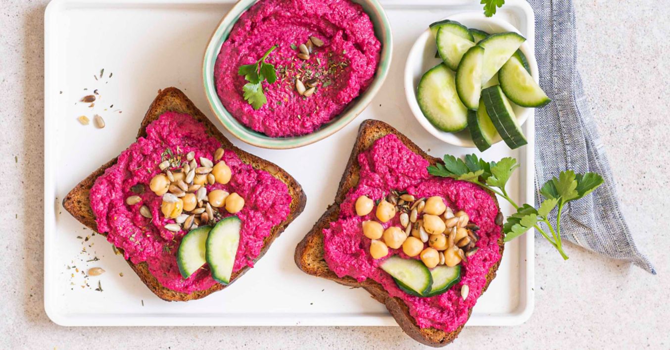 Řepu, cizrnu, citrónovou šťávu, tahini, česnek, římský kmín a olivový olej rozmixujte najemno.