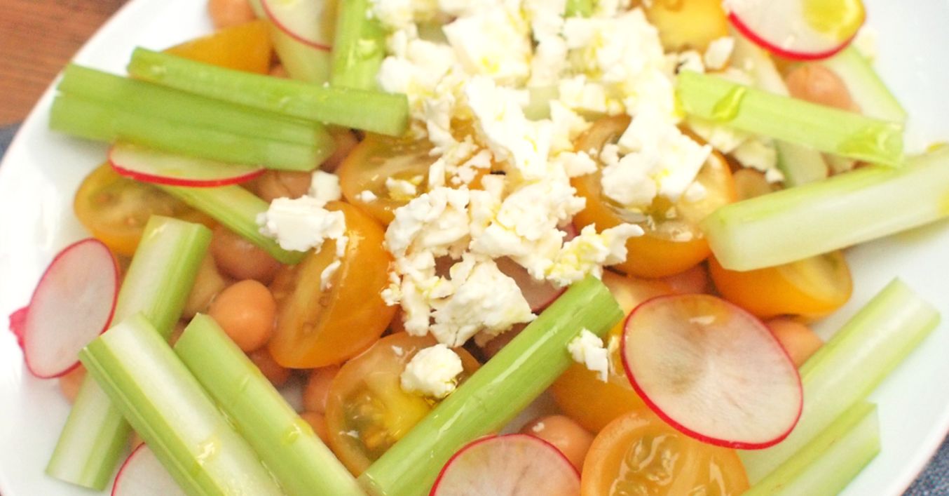 V míse promícháme cizrnu, rajčata a ředkvičky. Osolíme, opepříme a promícháme s olivovým olejem a s octem. Rozdělíme na porce, přidáme celer a dozdobíme sýrem feta.