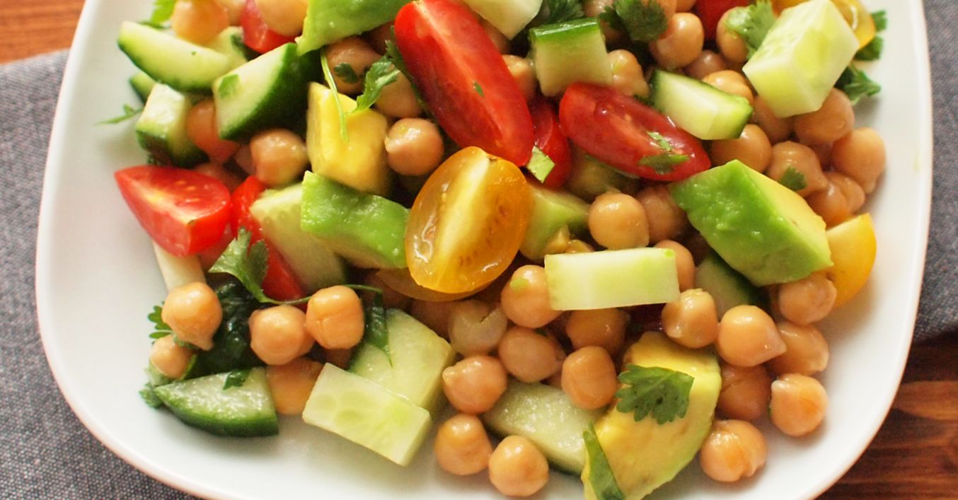 Cizrnu scedíme a necháme okapat. Okurky očistíme a nakrájíme na tenké plátky. Avokádo oloupeme, zbavíme pecky a nakrájíme na kostičky. Rajčata očistíme a nakrájíme na kostičky. Cibuli oloupeme a nasekáme nadrobno. V míse promícháme okurky, avokádo, rajčata, cizrnu, cibuli a nasekaný koriandr. Zakápneme olivovým olejem a dochutíme solí, pepřem a trochou octa.