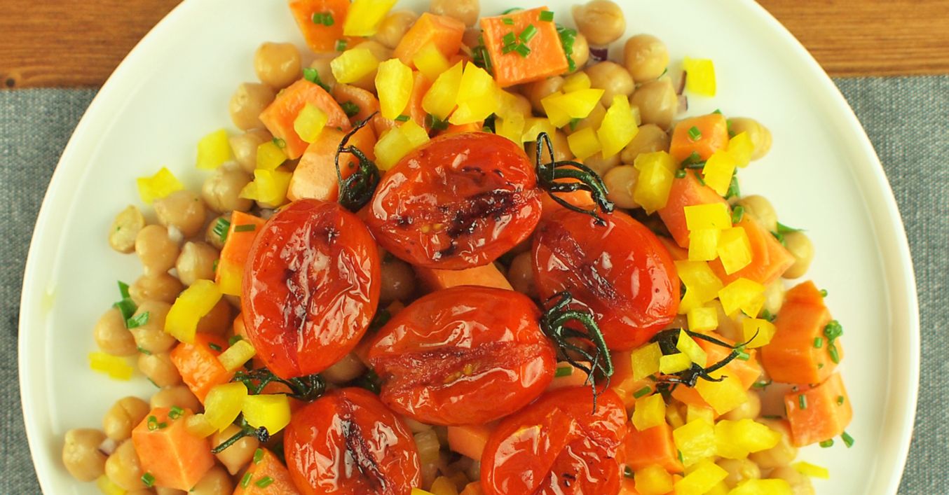 Cizrnu scedíme a promícháme s nasekanými bylinkami, šalotkou, zbylým olivovým olejem, octem a paprikou. Osolíme, opepříme a necháme chvíli odležet. Společně pak podáváme s pečenou dýní a rajčaty.