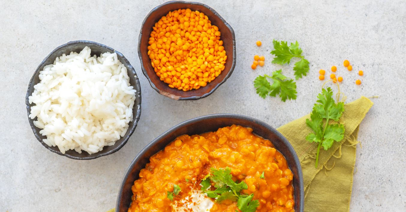 Cibuli a česnek nakrájejte najemno. V hrnci rozehřejte olej a cibuli s česnekem orestujte dozlatova. Přidejte červenou čočku, římský kmín, papriku, chilli, sůl a zalijte vodou. Vařte 20 minut doměkka. Pak zjemněte smetanou. Podávejte s rýží.
