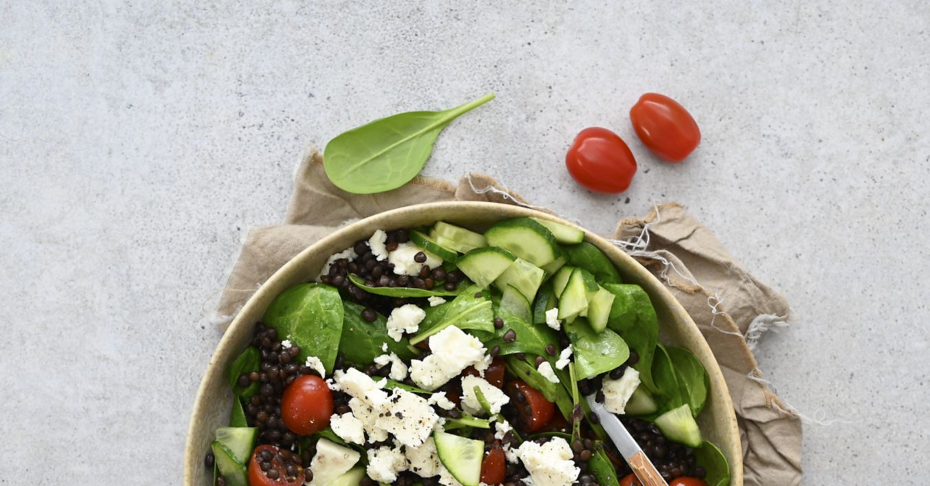 Čočkový salát se špenátem, rajčaty a balkánským sýrem