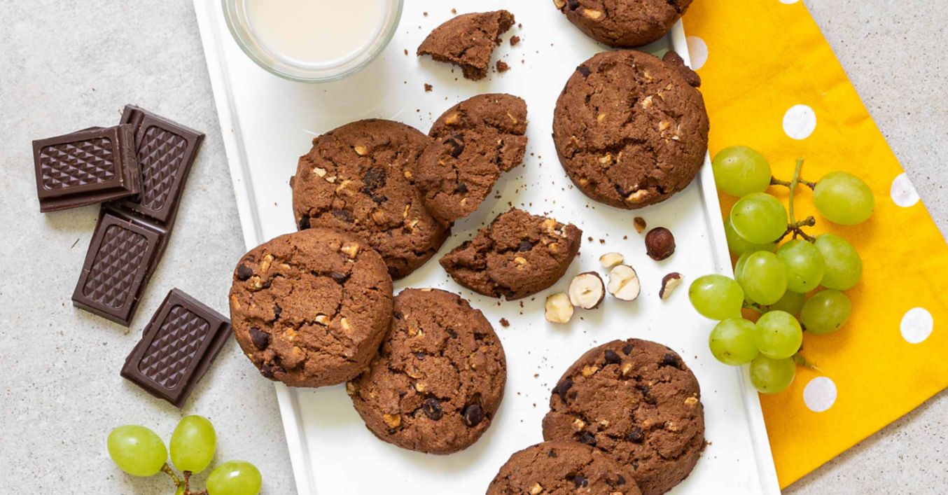 Mouku promíchejte s kakaem, kypřícím práškem do pečiva a sodou. Lískové oříšky nakrájejte nahrubo.