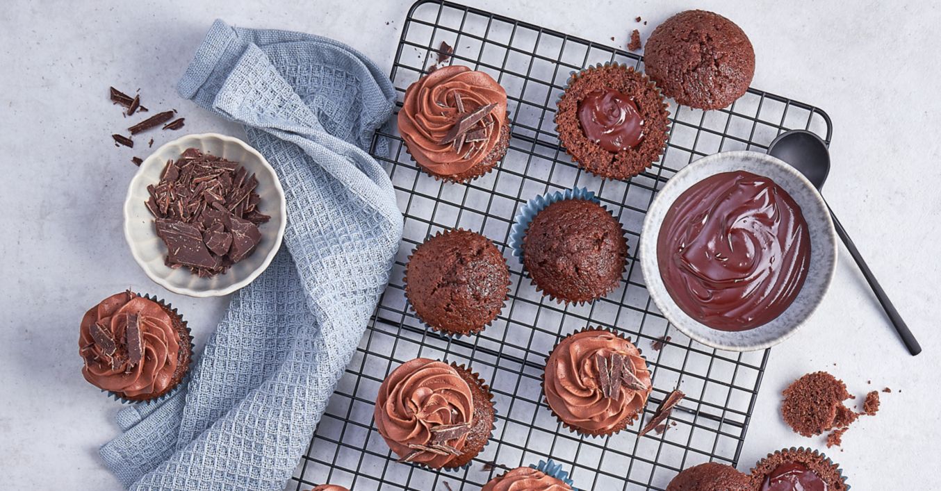 Předehřejte horkovzdušnou troubu na 160 stupňů (180 stupňů horní/spodní ohřev). Na těsto vyšlehejte máslo, cukr a vanilkový cukr do nadýchané hmoty a postupně vmíchejte vejce. Polevu nasekejte nahrubo, smíchejte s moukou, kakaem, solí a práškem do pečiva a s máslovou směsí a mlékem vypracujte hladké těsto. Těsto rozdělte do 12 košíčků na muffiny, pečte ve střední části trouby 20–25 minut a nechte vychladnout na mřížce.
