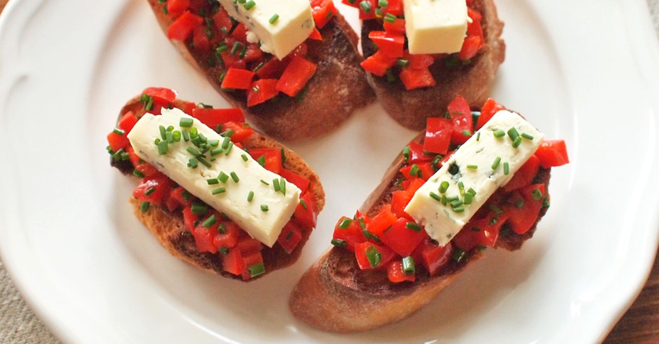 Na crostini dáme vrstvu pečených paprik, přidáme rozdrobený nebo nakrájený plísňový sýr a podáváme.