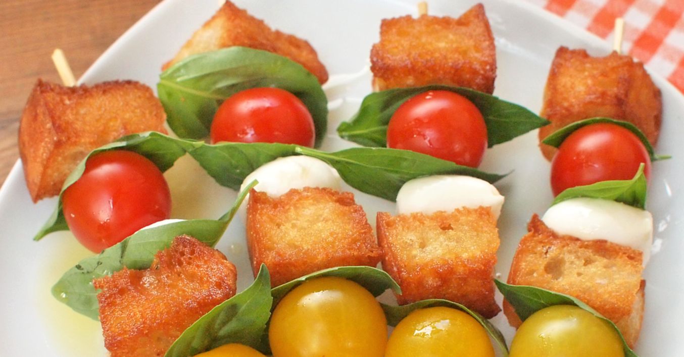 Připravíme si malé špízy, na které střídavě napichujeme křupavou bagetu, rajčata, mozzarellu a bazalku.