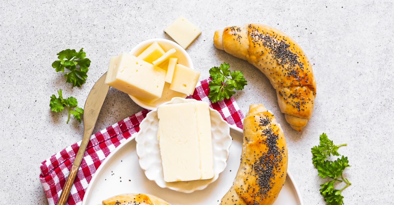 Mouku spolu s droždím, mlékem a solí dejte do mísy od robota. Hněťte na střední rychlost 10 minut, pak přidejte máslo. Pokračujte v hnětení dalších 10 minut.