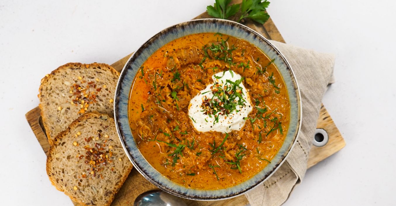 Maso nakrájené na kostky přidejte k cibuli a orestujte ze všech stran. Osolte, přidejte sladkou i pálivou papriku, zarestujte a zalijte vývarem.