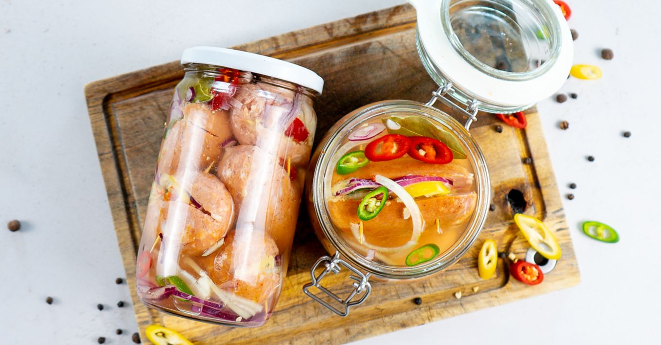 Naplněné špekáčky poté klademe jeden těsně vedle druhého do velké zavařovací sklenice nebo je rozdělíme do několika menších sklenic. Do prostor mezi špekáčky rozložíme koření z láku, cibuli, popřípadě další feferonky.