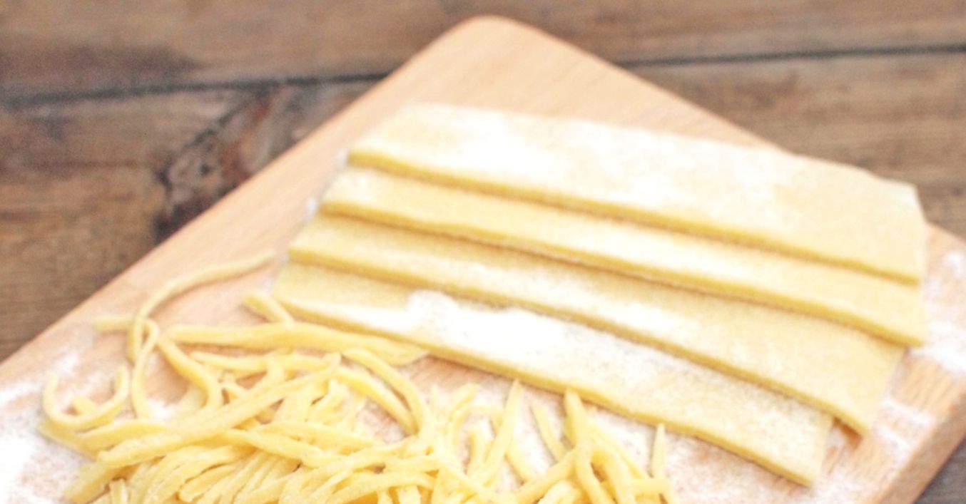 Odpočaté těsto rozválíme na tenký plát, zaprášíme moukou a necháme chvíli oschnout. Poté plát nakrájíme na pásy a ty potom na nudle nebo flíčky podle potřeby.
