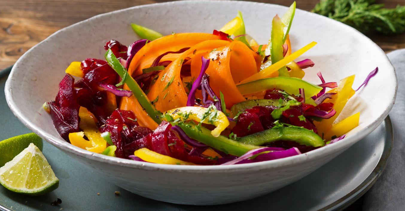 Mrkev oloupeme a nastrouháme na jemno na struhadle. Papriky očistíme, zbavíme jádřince a nakrájíme na nudličky. Zelí zbavíme košťálu, očistíme a nakrouháme na nudličky. Řepu oloupeme a nakrájíme na tenké nudličky.