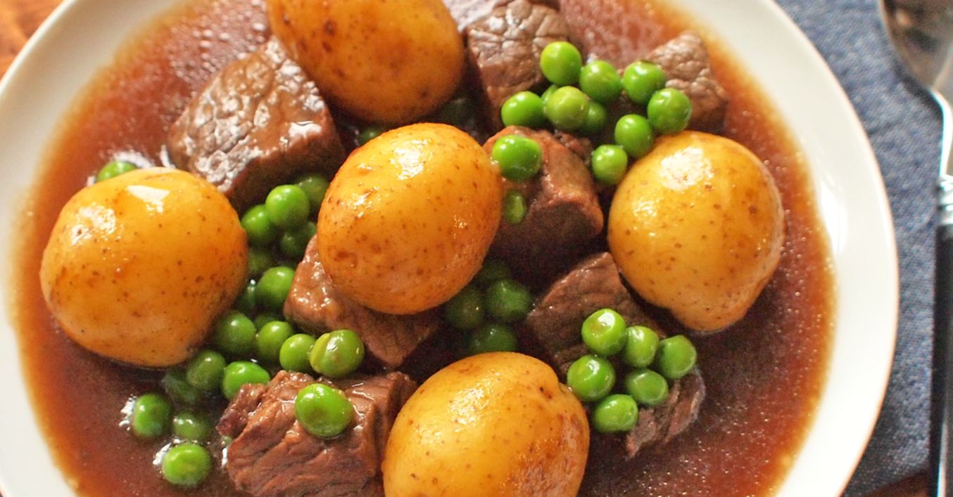 Asi 30 minut před koncem přidáme k masu i brambory a uvaříme doměkka. Úplně na konec přidáme hrášek a společně ohřejeme.