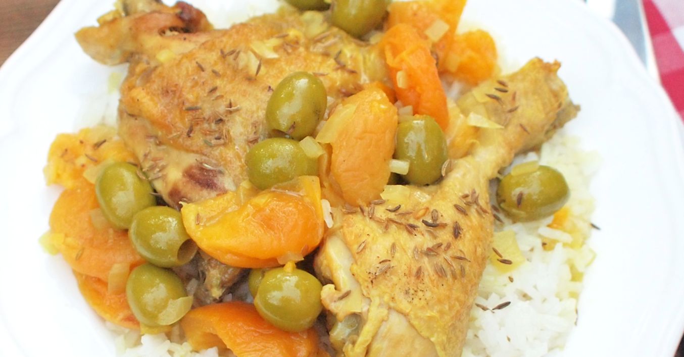 Zalijeme vínem a necháme téměř vyvařit. Přidáme horký vývar, kuřecí stehna, olivy, meruňky, bobkový list a přivedeme k mírnému varu. Podle potřeby dochutíme solí, pepřem a římským kmínem. Dusíme asi 45 až 60 minut do změknutí.