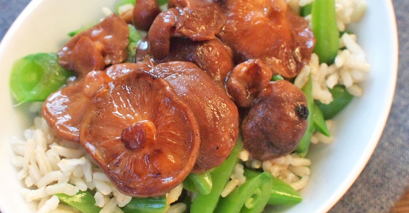 Zbylý olej rozpálíme, přidáme houby a zprudka orestujeme (asi 5 minut). Zmírníme plamen, přidáme cukr, ocet, pepř a sójovou omáčku. Zvolna podusíme asi 8 minut do změknutí. Rýži promícháme s hráškem a podáváme s dušenými houbami.