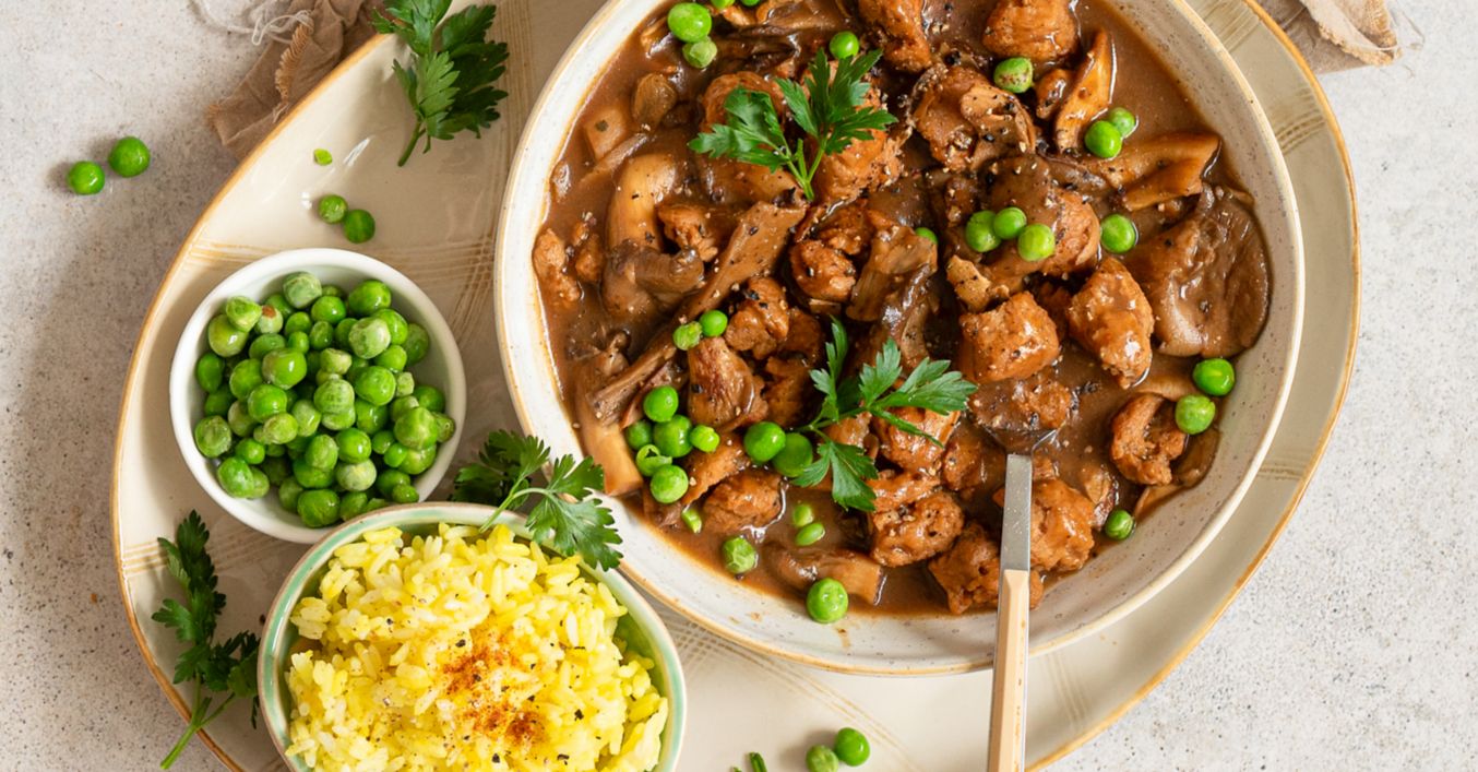 Dušené vepřové s houbami a hráškem