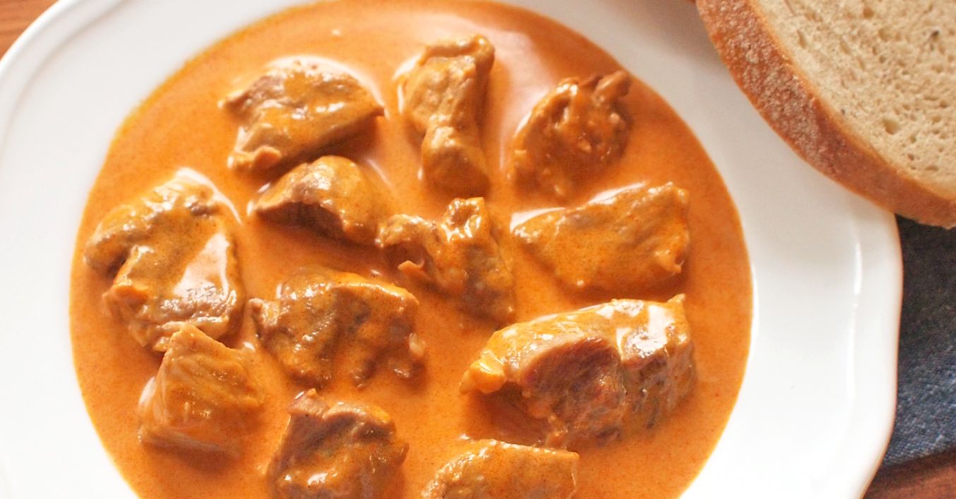 Pomalu dusíme do změknutí, podle potřeby podléváme dalším vývarem nebo vodou. Když je maso měkké, odvaříme vývar na hustou šťávu. Odstavíme, vmícháme smetanu a podle potřeby dochutíme.