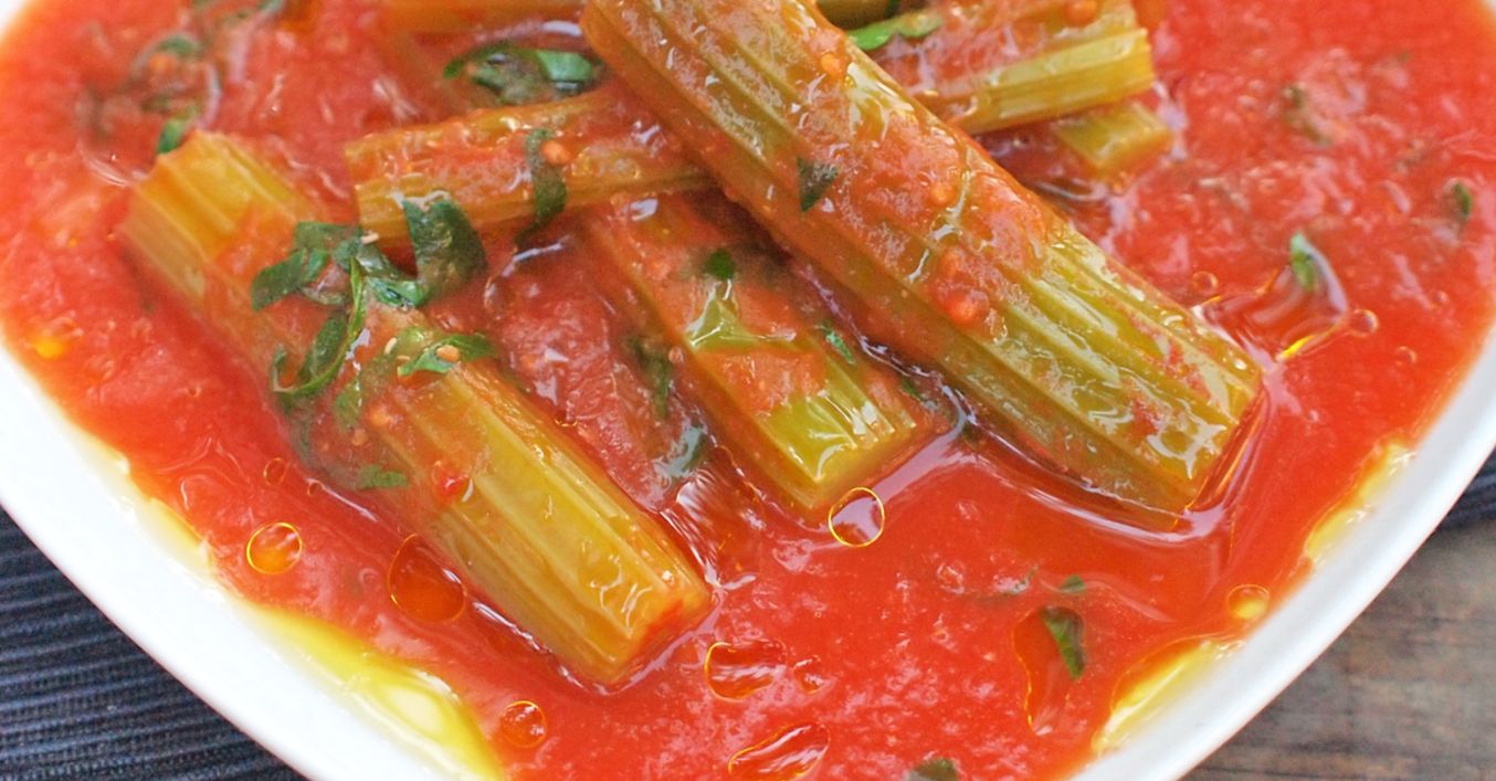 Řapíkatý celer očistíme a nakrájíme na asi 10 cm dlouhé tyčinky. Šalotku s česnekem oloupeme. Šalotku nasekáme nadrobno, česnek nakrájíme na plátky.