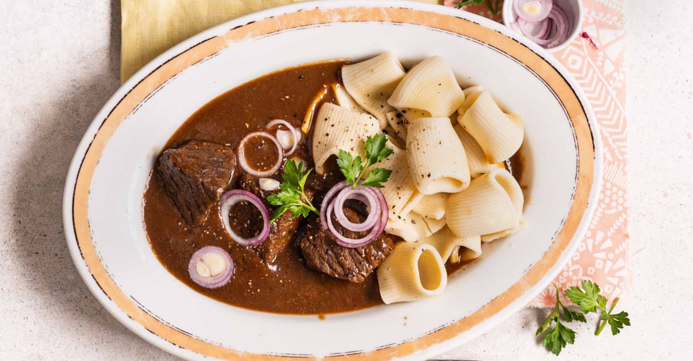 Dušený hovězí guláš na červeném víně