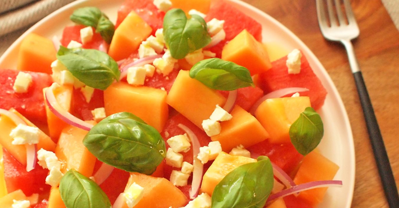 Meloun vykrojíme, zbavíme pecek a nakrájíme na kostky. Cibuli oloupeme a nakrájíme na tenké nudličky. Sýr feta rozdrobíme nadrobno.