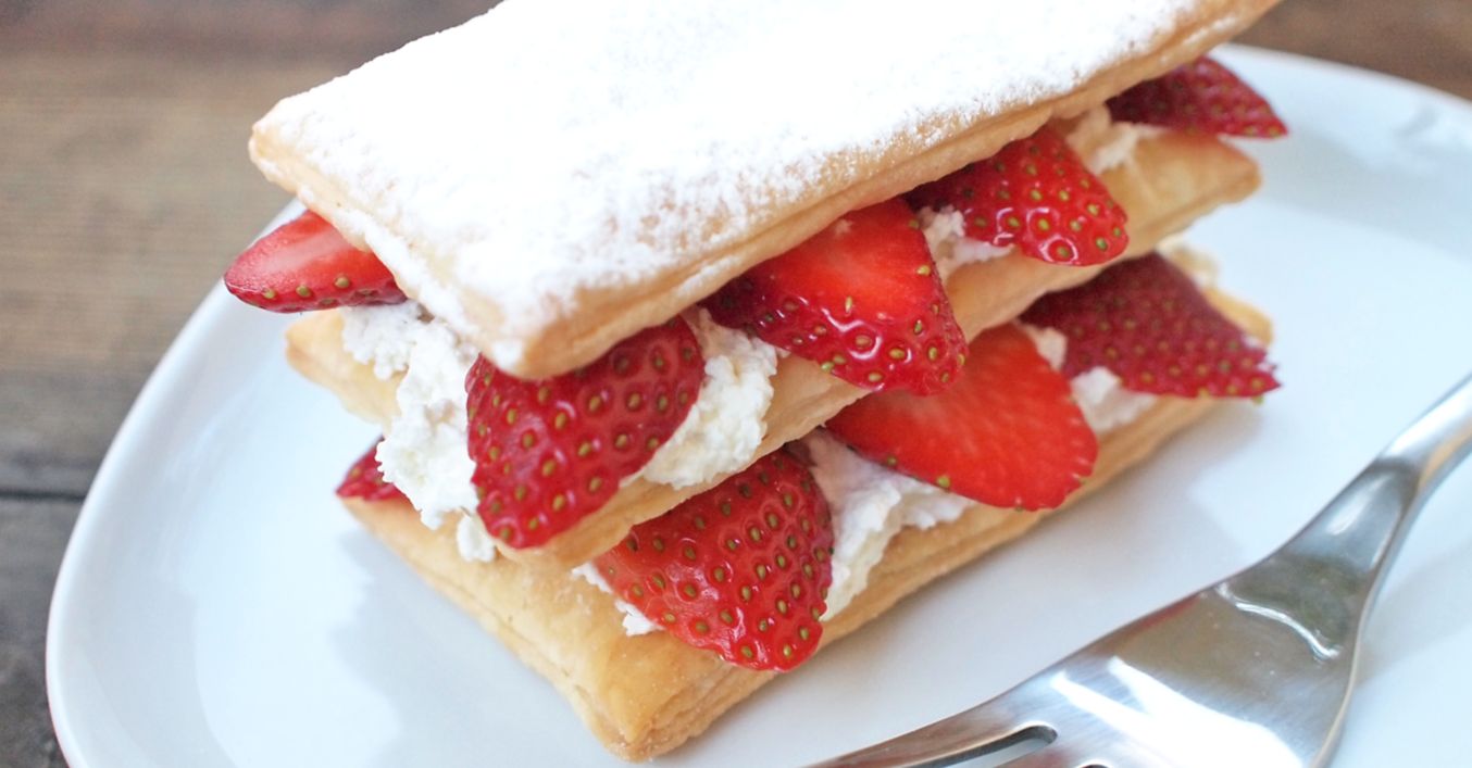 Z vychladlých plátů těsta, šlehačky a jahod sestavíme jednotlivé dortíky. Začínáme vždy plátem těsta, na který dáme šlehačku, vrstvu jahod a znovu trochu šlehačky. Poté přidáme druhý plát a celý postup zopakujeme. Přiklopíme posledním plátem těsta, zaprášíme moučkovým cukrem a ihned podáváme.