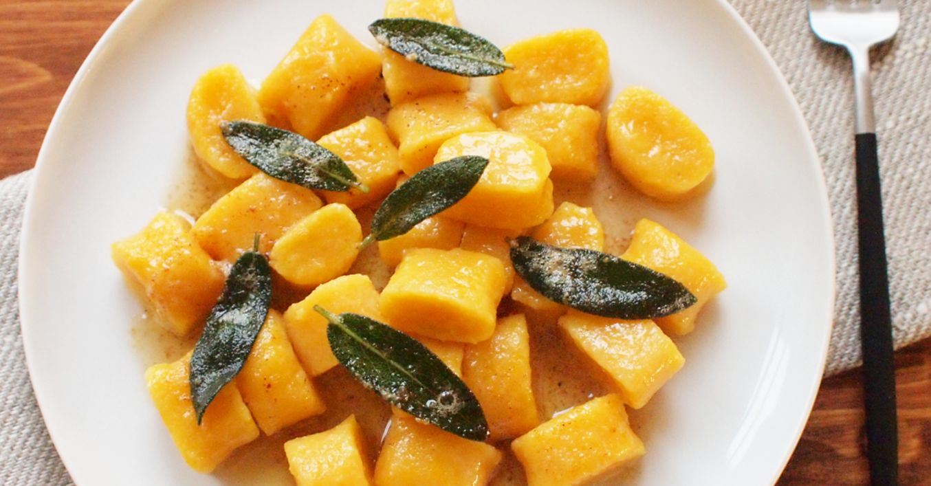 Prolisované brambory, dýni a vejce dáme do mísy. Osolíme a promícháme. Poté postupně přidáváme mouku a hněteme, dokud nedostaneme vláčné a nepříliš lepivé těsto (množství mouky upravíme podle vodnatosti brambor a dýně).