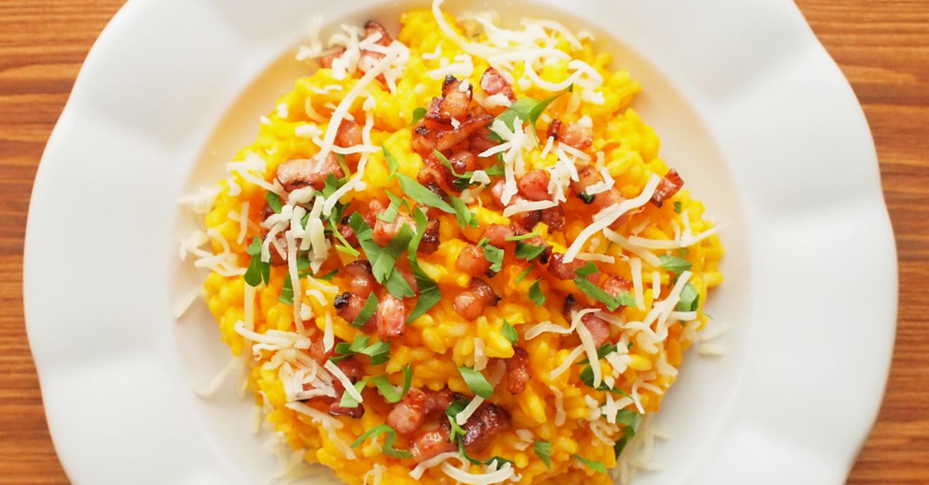Rýži uvaříme ve vroucí osolené vodě podle návodu na obalu. Dýni očistíme, zbavíme středu se semínky a nakrájíme na menší kostky. Cibuli a česnek oloupeme a nakrájíme nadrobno. Anglickou slaninu nakrájíme na nudličky a na trošce másla orestujeme dozlatova.