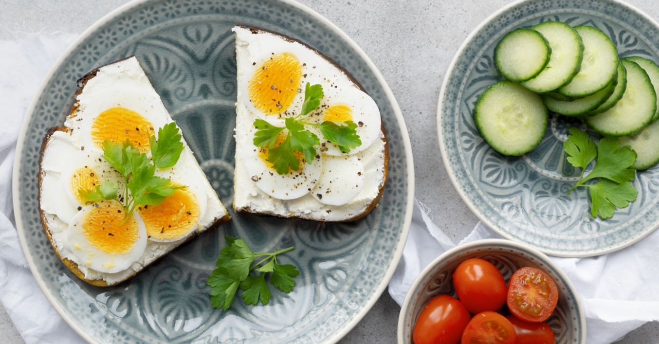 Chléb potřete lučinou, obložte vejcem a čerstvou petrželkou. Podávejte s rajčátky a okurkou.