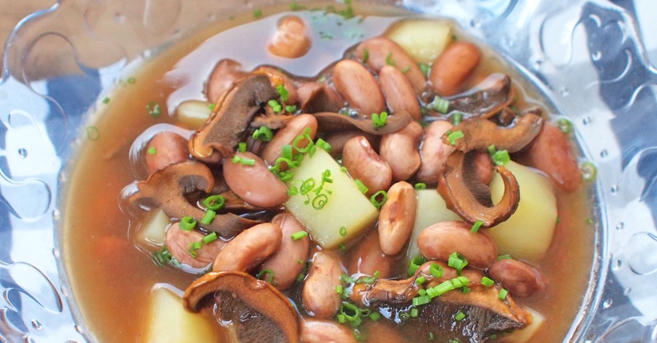 Půl hodiny před koncem vylovíme bobkový list, přidáme namočené hřiby a nakrájenou bramboru.