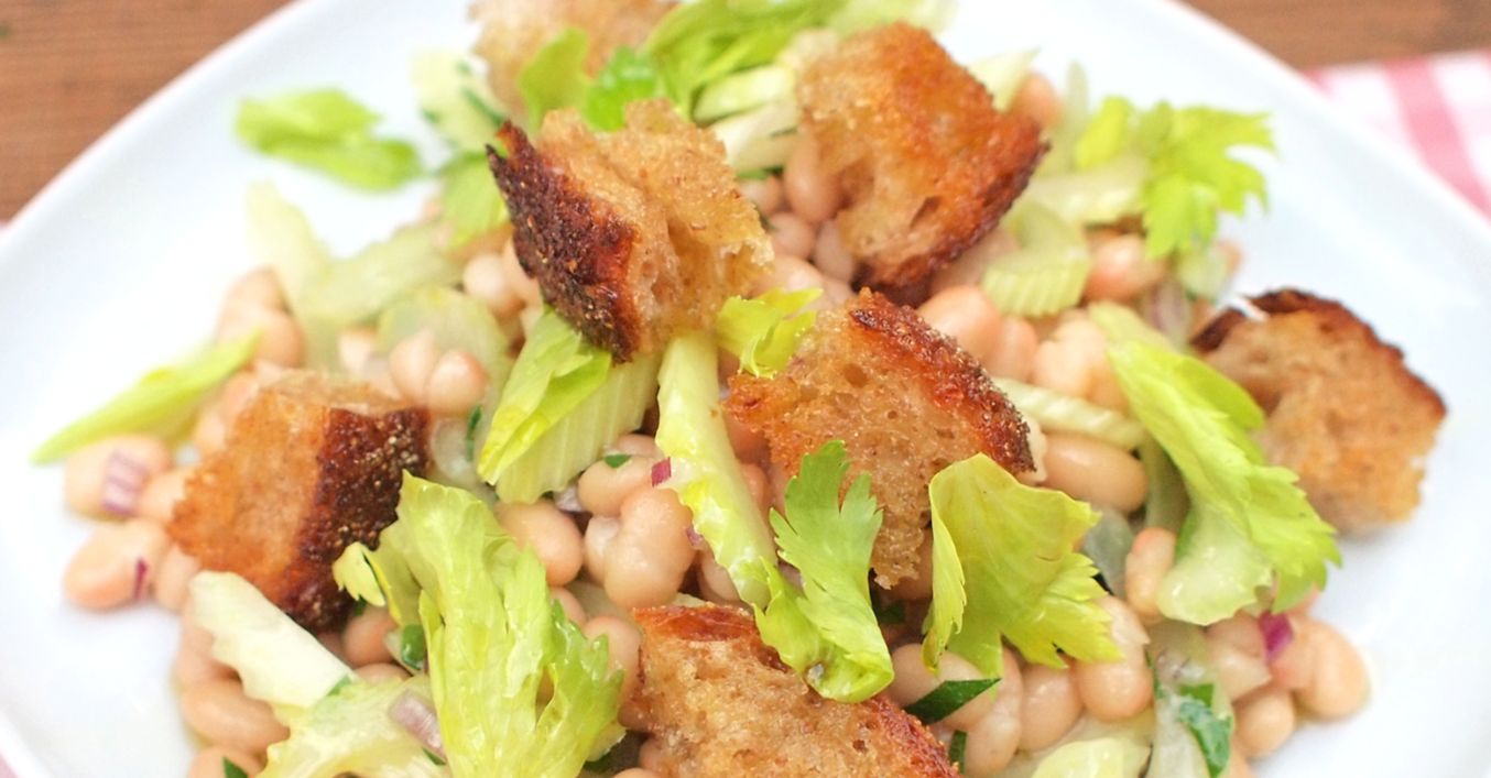 V míse smícháme uvařené fazole, celer, petržel, šalotku, olivový olej a ocet. Dochutíme solí a pepřem. Podáváme spolu s křupavými chlebovými krutony.
