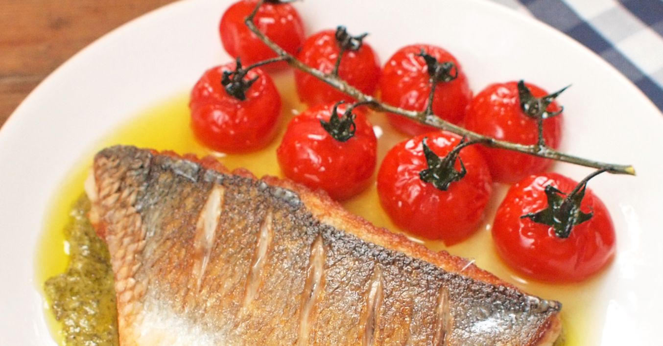 Dno talíře potřeme dílem bazalkového pesta. Přidáme filet křupavou kůží nahoru a servírujeme spolu s upečenými třešňovými rajčaty.