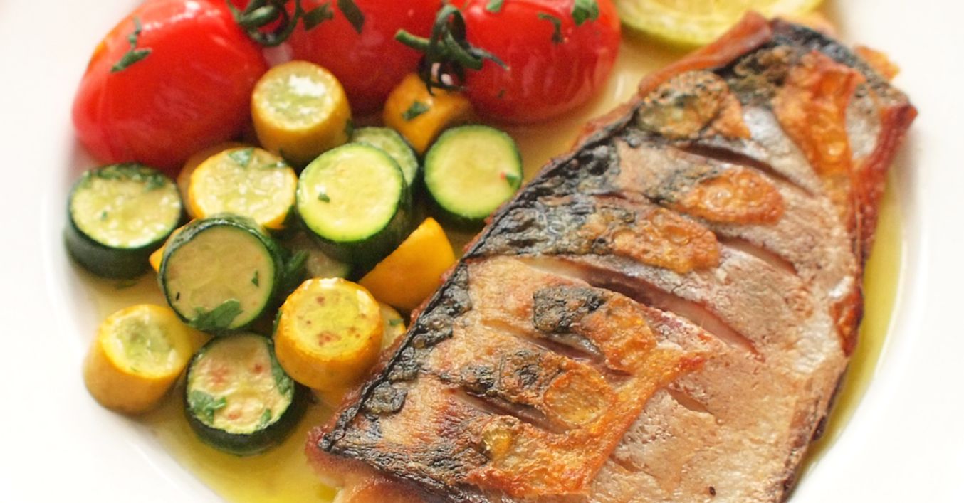 Pečenou zeleninu promícháme s bylinkami a podáváme společně s filety makrely, které zakápneme citronem.