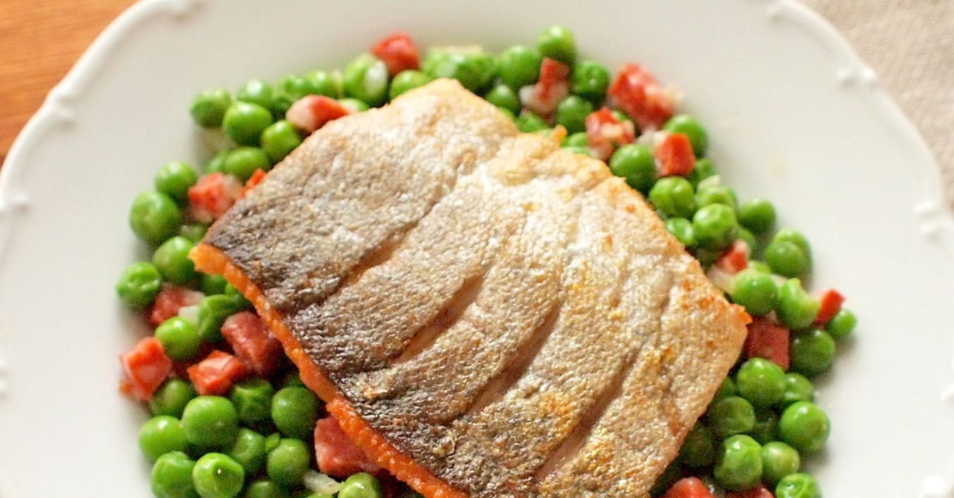 Filet ze pstruha s hráškem a paprikovou klobáskou