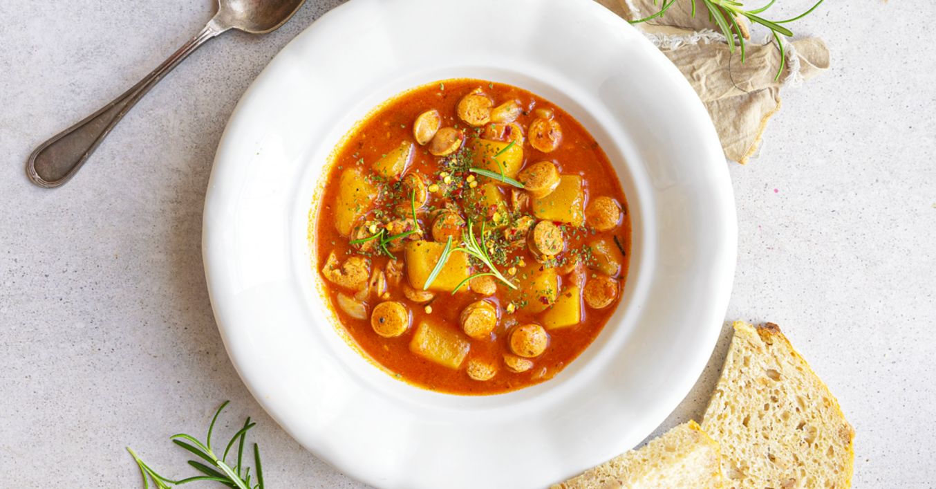 Na oleji orestujte nejdříve cibuli dozlatova. Pak přidejte párky. Restujte další dvě minuty.
