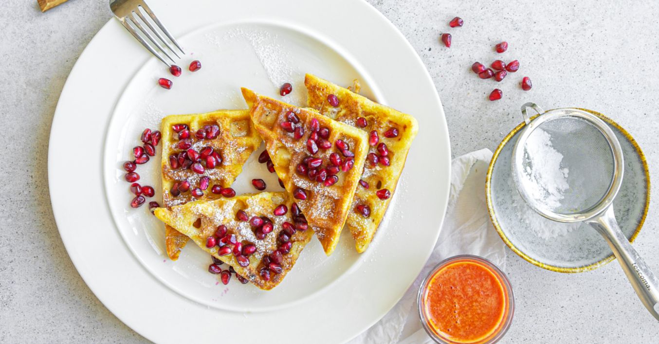 Opečené vafle pocukrujte. Podávejte se semínky z granátového jablka a čerstvou grepovou šťávou.