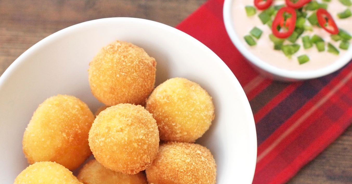 Kuličky smažíme v rozpáleném oleji dozlatova. Hotové kuličky necháme chvíli odkapat na papírovém ubrousku a ihned podáváme.