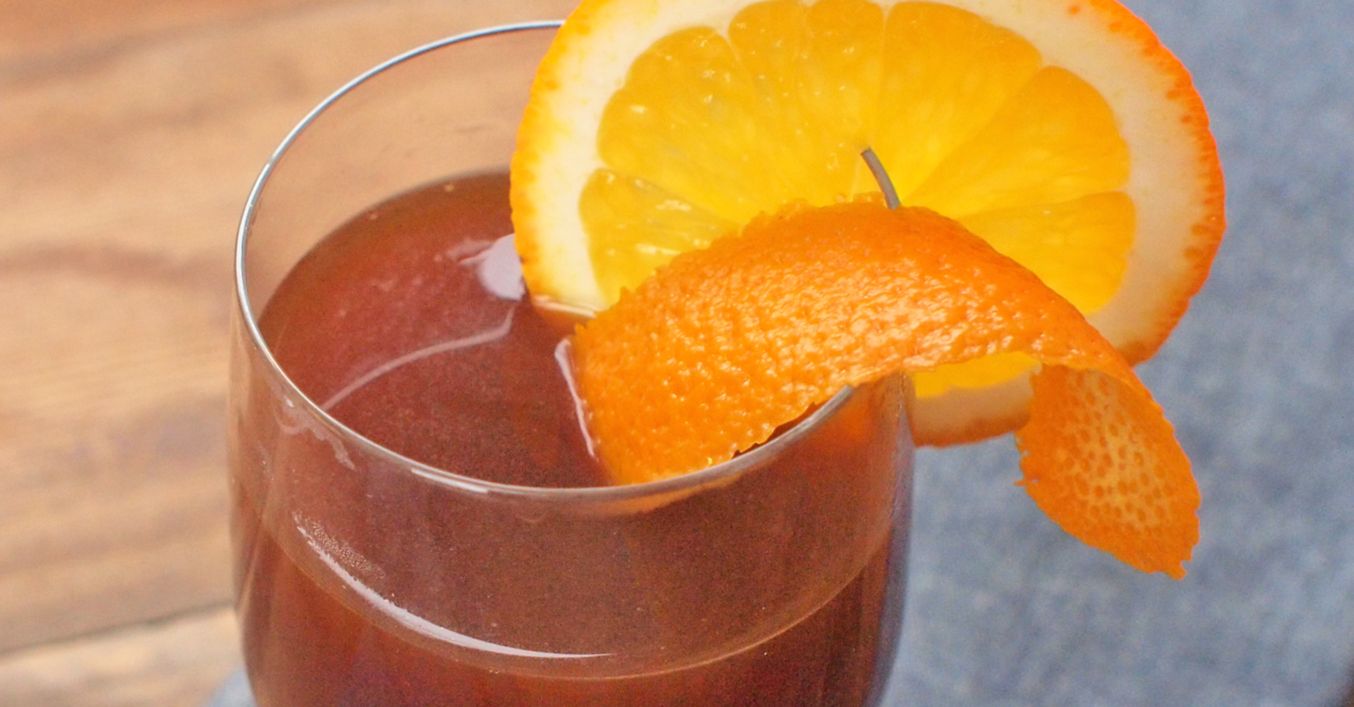 Z pomeranče škrabkou seřízneme dva proužky pomerančové kůry, kterou zkroutíme do spirálky. Ze zbylé části odkrojíme 2 plátky.