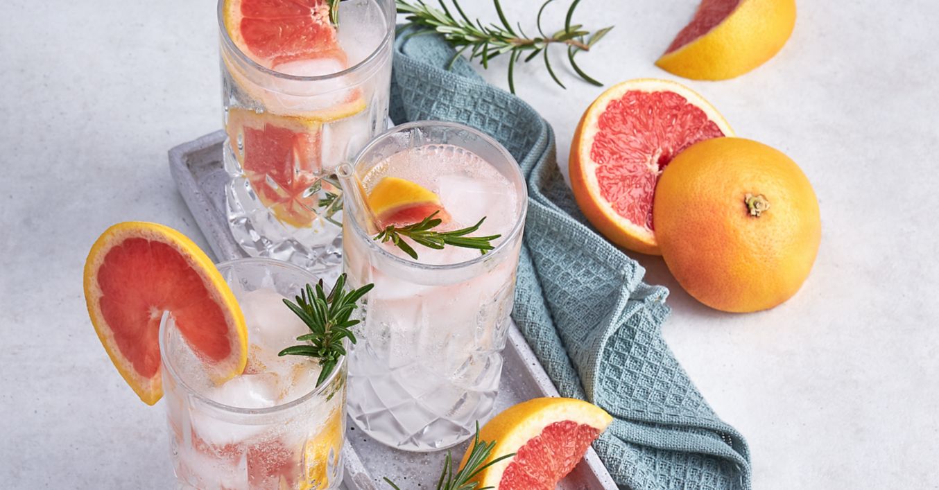 Grapefruitové měsíčky rozdělte do 2 sklenic s kostkami ledu a vodkou, zalijte minerální vodou a podávejte ozdobené snítkami rozmarýnu.