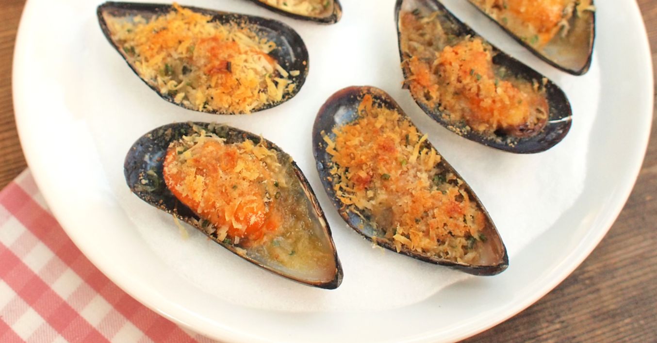 Odstavíme a necháme vychladnout. Mušle si rozložíme na plech a zbavíme je přebytečných skořápek. Strouhanku smícháme s nasekaným česnekem, petrželí, parmazánem a olivovým olejem. Dochutíme solí a pepřem.