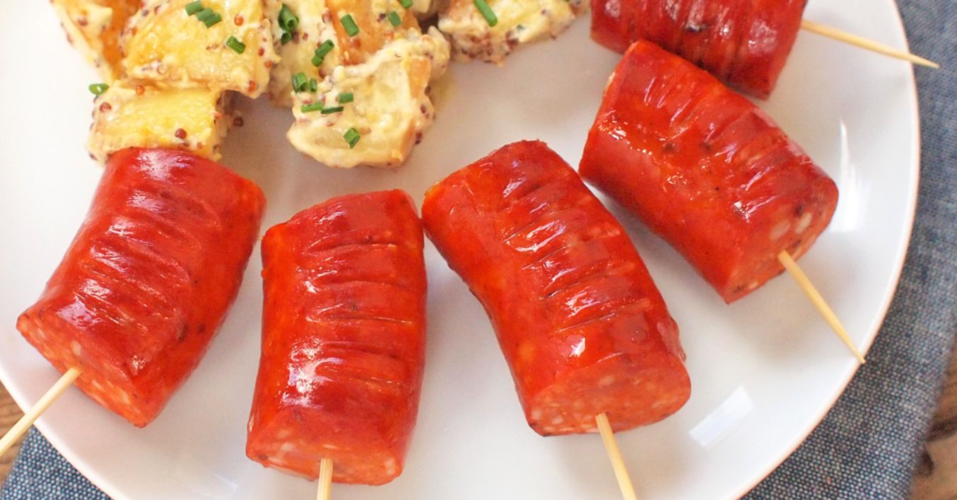 Klobásky rozdělíme na menší porce, které několikrát ozdobně nařízneme a ogrilujeme na rozehřátém grilu (asi 8 až 10 minut). Grilované klobásky napíchneme na špejle a servírujeme společně s bramborami.