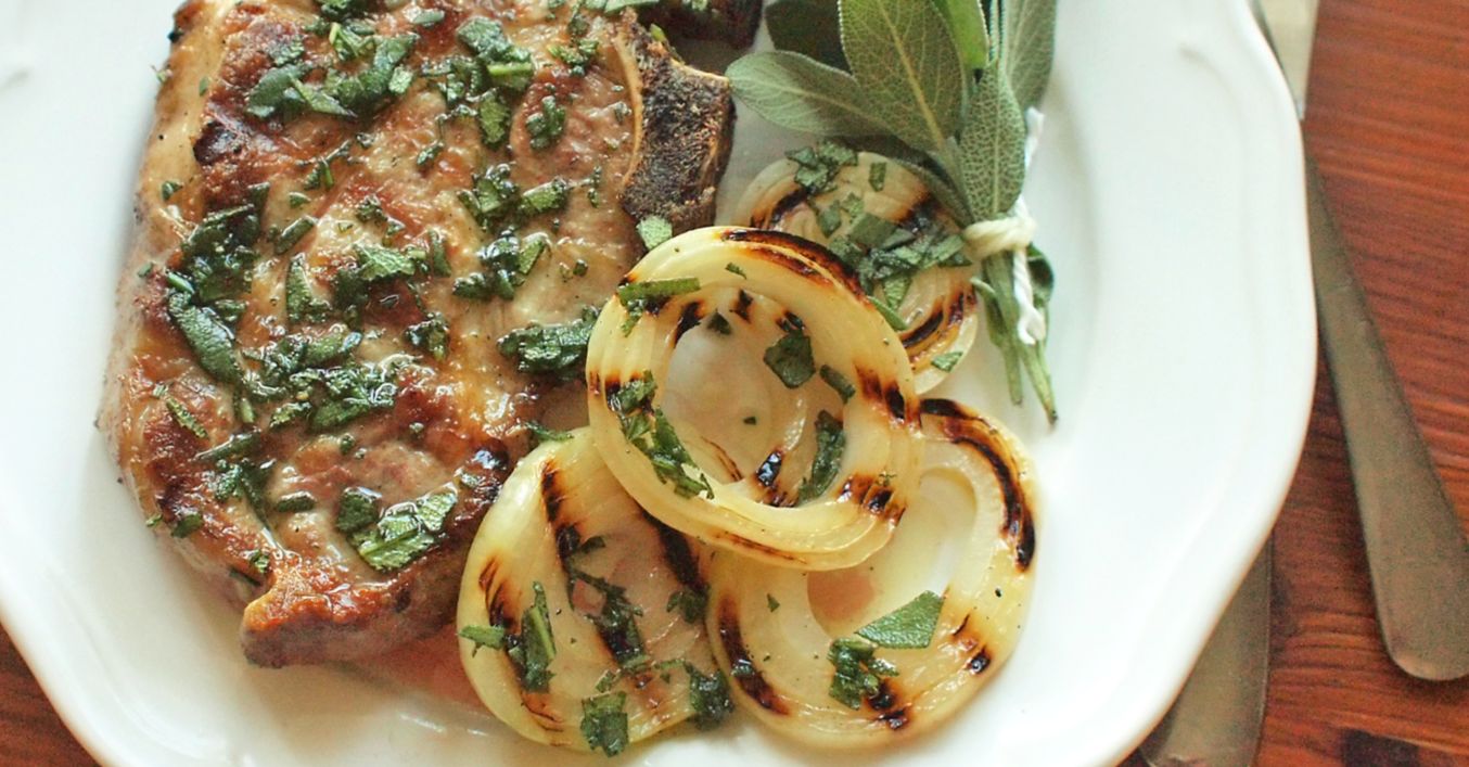 Maso očistíme a osušíme. Šalvěj i oloupaný česnek nasekáme nadrobno. Plátky krkovice pak důkladně osolíme, opepříme a promasírujeme společně s česnekem.