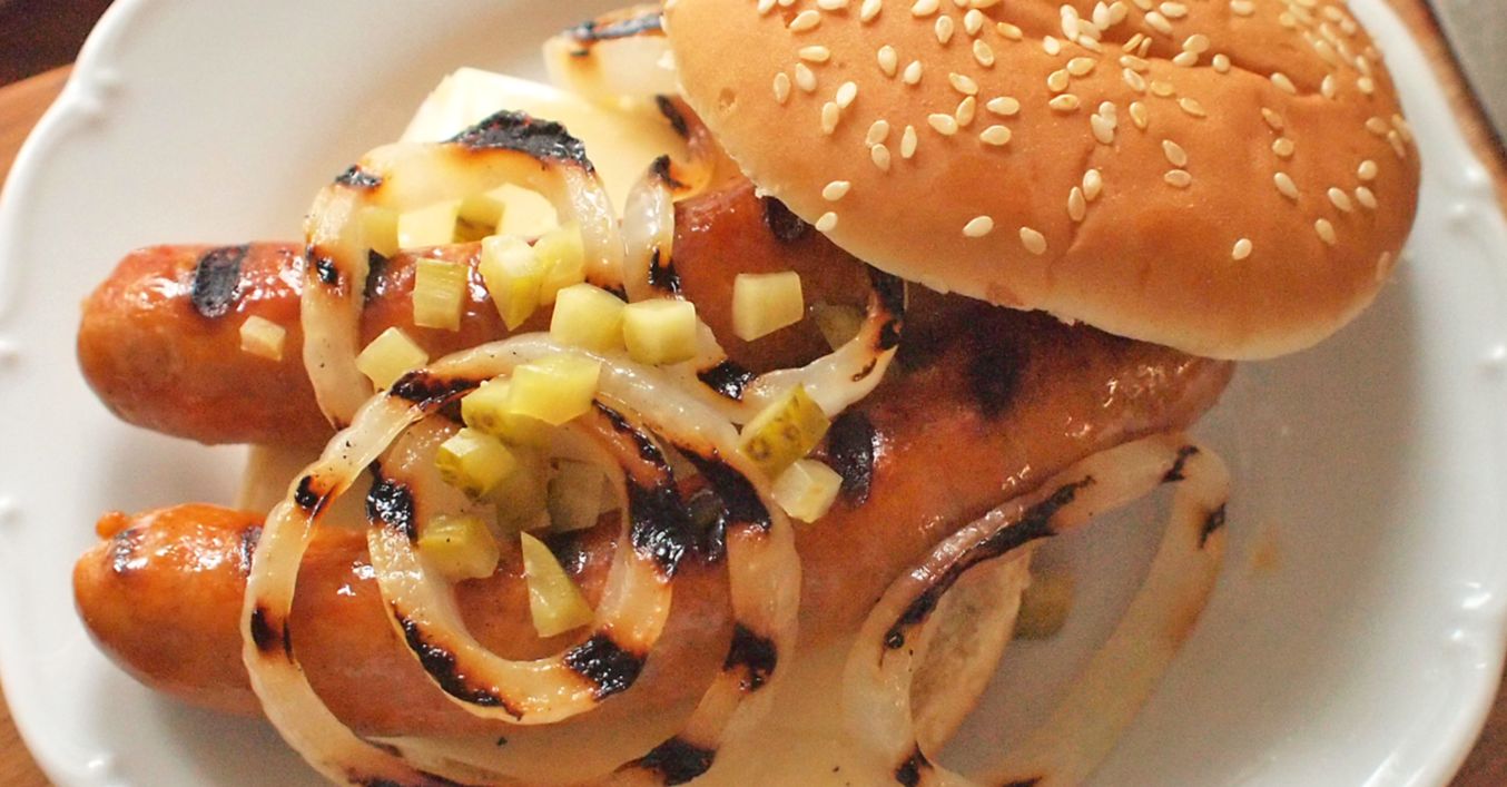 Žemle rozkrojíme a ohřejeme na pánvi nebo na grilu. Rozpečenou žemli potřeme hořčicí, přidáme plátek sýra, klobásky a grilovanou cibuli. Ihned podáváme.