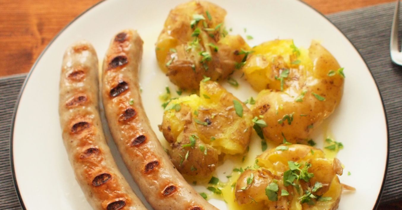 Klobásky grilujeme na rozehřátém grilu z obou stran (dohromady asi 8 až 10 minut podle tloušťky). Podáváme společně s bramborami, které před podáváním rozmačkáme a zalijeme rozpuštěným máslem s pažitkou.