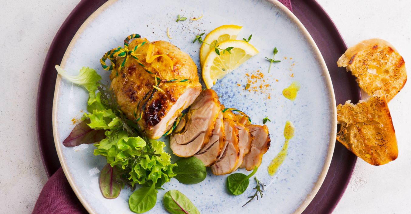 Hotové kuře nakrájíme na plátky a servírujeme se salátem a grilovanou ciabattou.