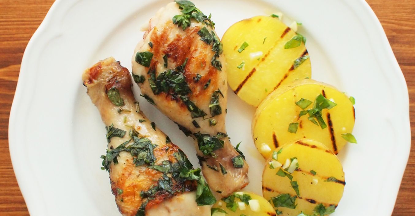 Kuřecí paličky i brambory grilujeme na rozehřátém grilu. Brambory z obou stran (dohromady asi 8 minut). Kuřecí paličky nejprve na silnější žáru (6 minut), poté v nepřímém žáru do úplného propečení (asi 10 až 15 minut).